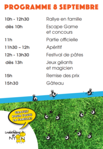 Pour célébrer cet anniversaire venez faire la fête avec nous. Les festivités commenceront à 10h, avec un rallye, des jeux et des concours pour petits et grands. Après un succulent Festival de pâtes, les animations continueront dans l’après-midi, pour se terminer vers 15h30 avec un grand gâteau d’anniversaire.