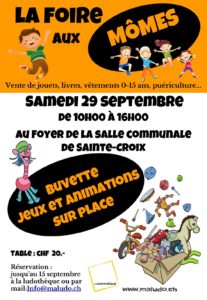 Venez nous retrouvez de 10h00 à 16h00 à l’espace Alexis Jaccard et sur le parvis de l’hotel de ville de Sainte-Croix pour une nouvelle animations faites pour les familles et pour les enfants