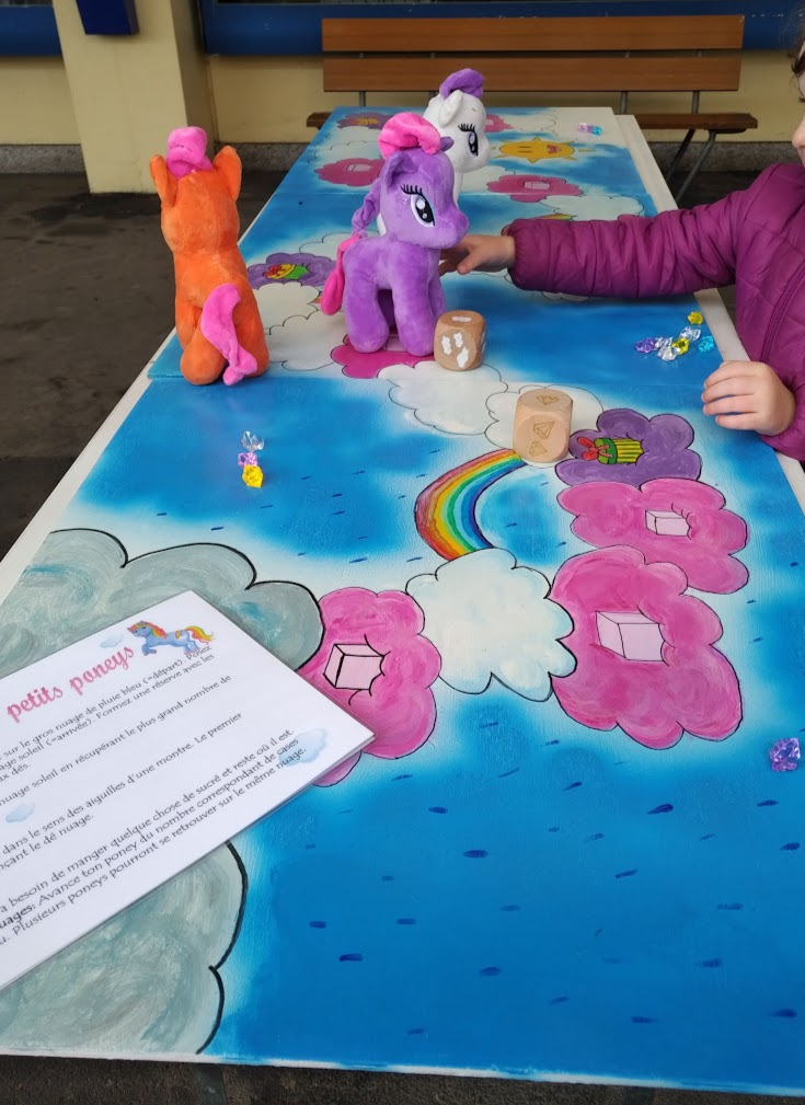 Comment jouer : Chaque joueur à son tour jette le dé et fait avancer son poney du nombre de nuages indiqué. Le premier qui atteint le nuage d’arrivée gagne un bonus de 4 cristaux. Le gagnant est celui qui a collecté le plus grand nombre de cristaux.
